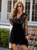 V-neck Stitching Mesh Waist Sequined Bubble Sleeve Dress