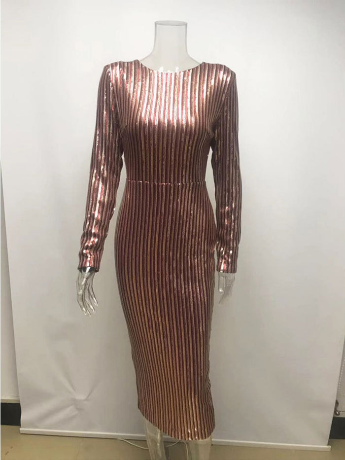 Elevate your wardrobe with this essential maxi dress, guaranteed to become a go-to favorite. Crafted from a luxurious gold sequin fabric, it features long sleeves and a flattering, form-fitting silhouette that accentuates your curves. Pair it with elegant high heels, complementing accessories, and a stylish shoulder bag to create a cohesive and chic ensemble.