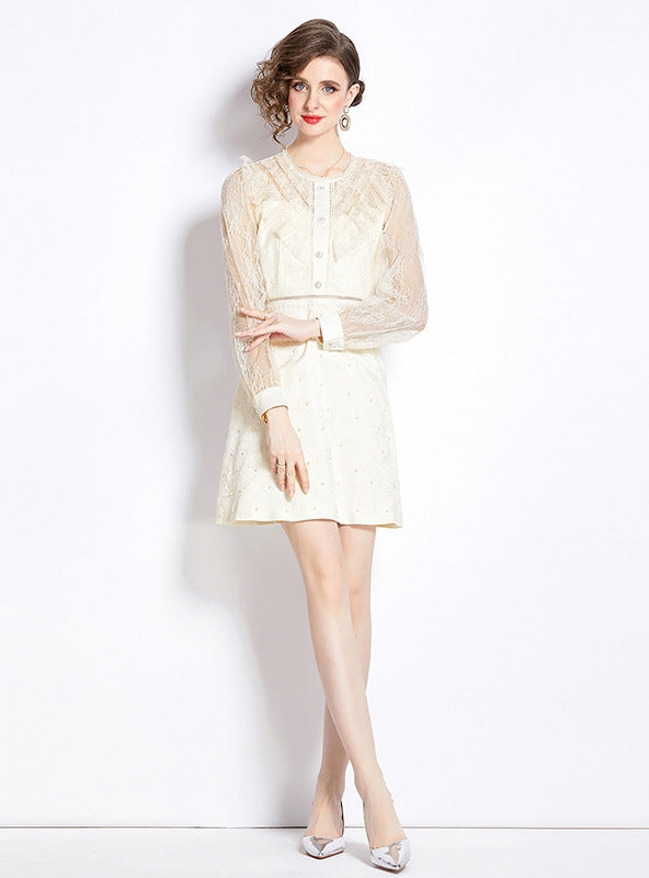 Radiating timeless elegance, this ivory-hued dress is a tribute to classic femininity with a modern flair. The soft palette whispers of vintage charm, while the delicate lace overlay on the bodice and sleeves adds a layer of sophistication. The high neckline, with its subtle stand collar, enhances the modesty, complementing the sheer long sleeves that hint at the skin beneath with a genteel allure. A line of dainty buttons leads the eye down to a gently tailored waist, creating a silhouette that celebrates the figure. The skirt, adorned with textured dots and finished with a discreet hem, provides just enough structure to dance gracefully above the knee. Perfect for bridal showers, elegant brunches, or the refined workplace, this dress invites admiration without saying a word.