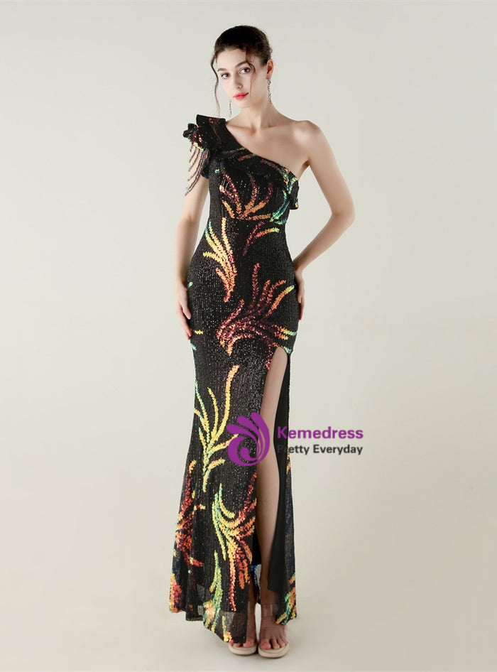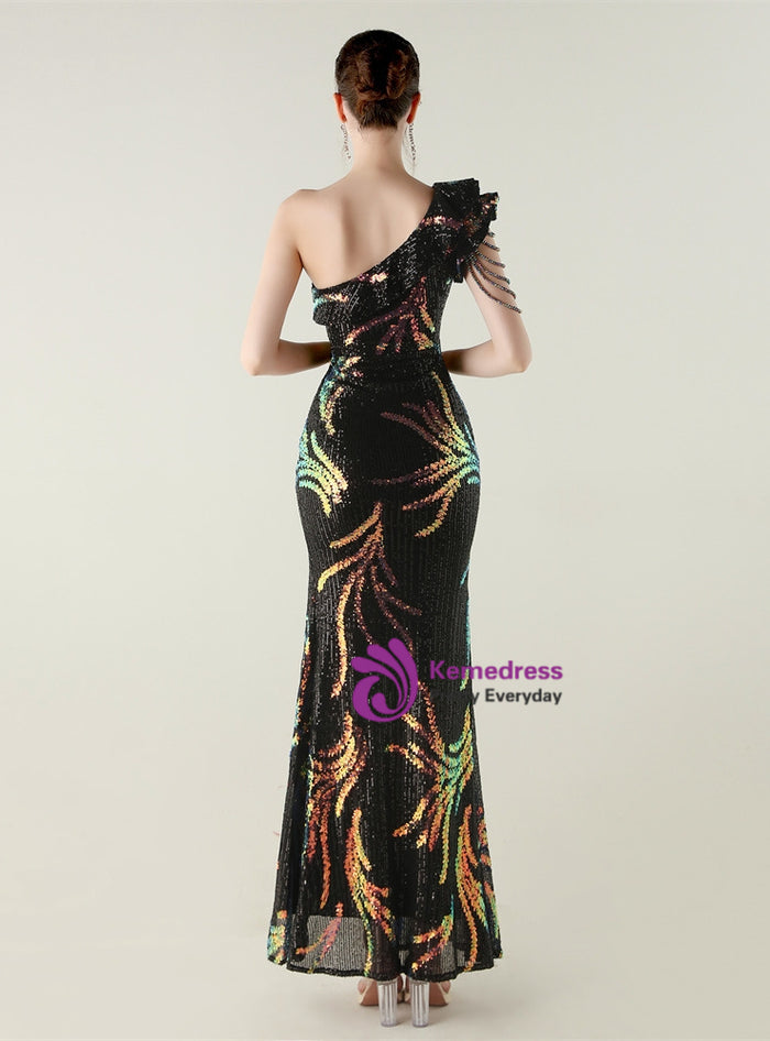 Black Mermaid Sequins One Shoulder Beading Prom Dress