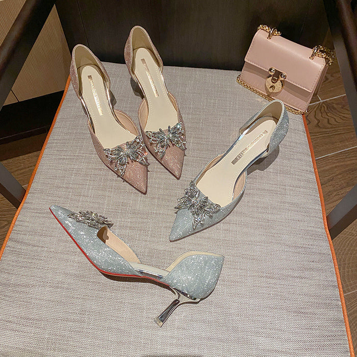 The high-heeled sandals feature a classic design with an eyeg-catching crystal butterfly, adding a touch of glamour to your look. The pointed toe and stiletto heel complete the stylish look, making these sandals perfect for both formal and casual occasions, from weddings and parties to daily wear. Made with high-quality synthetic materials, these sandals are comfortable and follow the natural curve of your foot. The wear-resistant rubber outsole ensures long-lasting comfort, making them perfect for all-day wear. Whether you're running errands or dressing up for a night out, these sandals will keep you comfortable and stylish.