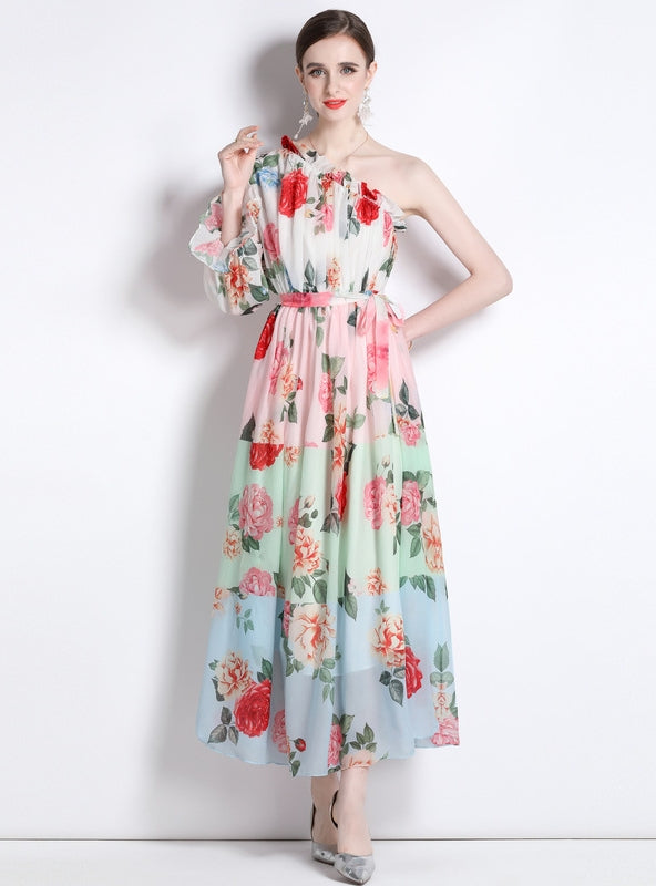 Garlanded in the freshest florals, this dress exclaims its beauty without saying a word! The off-shoulder detail, trimmed with ruffles, is a flirtatious nod to spring's playful side. The belt cinches comfortably at the waist, giving way to a skirt that blooms into a cascade of color, as if one is wearing a garden in motion. It's a piece for those who not only want to make an entrance but also want to leave a lasting impression of grace and vibrancy.