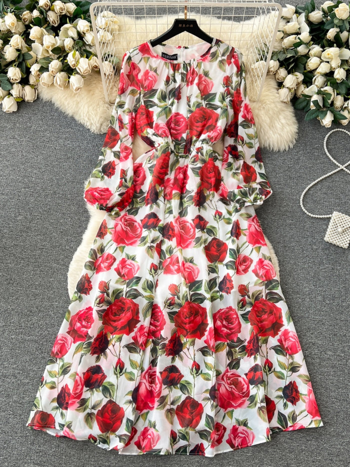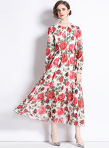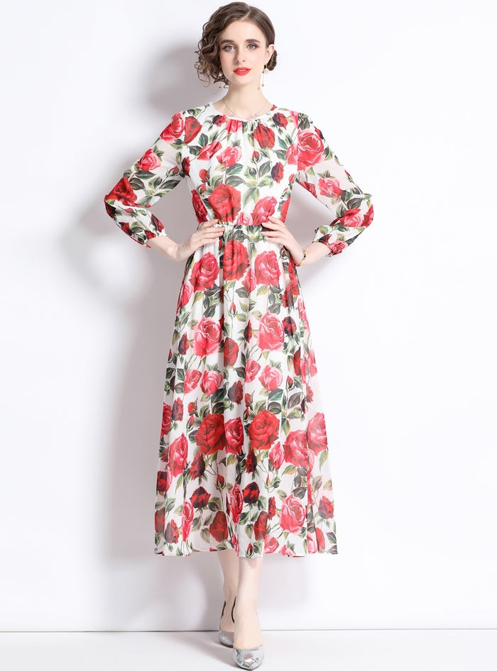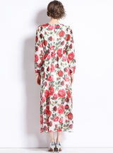 Chiffon Rose Printing Long Sleeve Casual Beach Dress