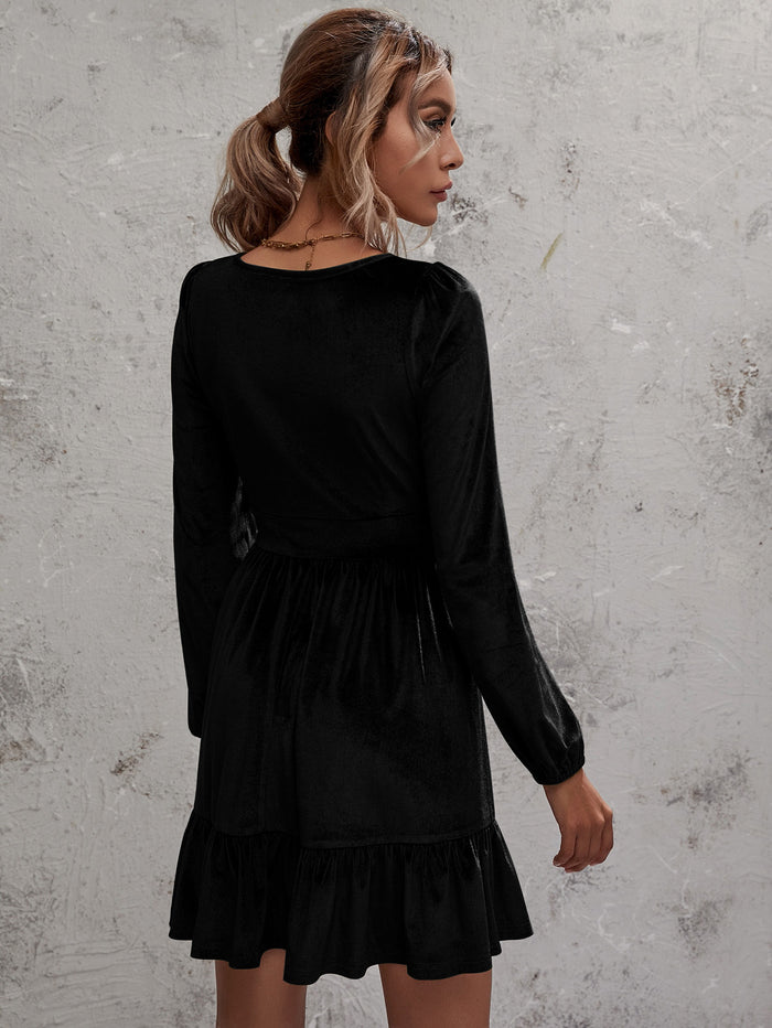 Mark the day in style with the velvet v neck shift dress. This chic dress features smooth woven satin that gracefully drapes across a wrap-style bodice with darts, long sleeves with gathered shoulders and elastic cuffs. Two ties cinch the waist to create a flattering silhouette, leading to a wrapping A-line skirt with a playful ruffled mini hem.