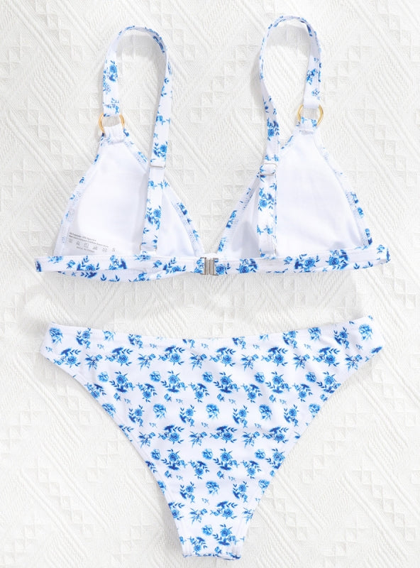 Make a splash at the beach with the adorable new Blue Floral Triangle Bikini Top from Lilacoo. Featuring a playful floral print, this classic triangle bikini top is designed with adjustable straps, a flattering v-neckline, and an adjustable tie closure at the back.Featuring a playful floral print, this low-rise bikini bottom is designed with an extra high-cut leg for a flirty flair and cheeky seat coverage.