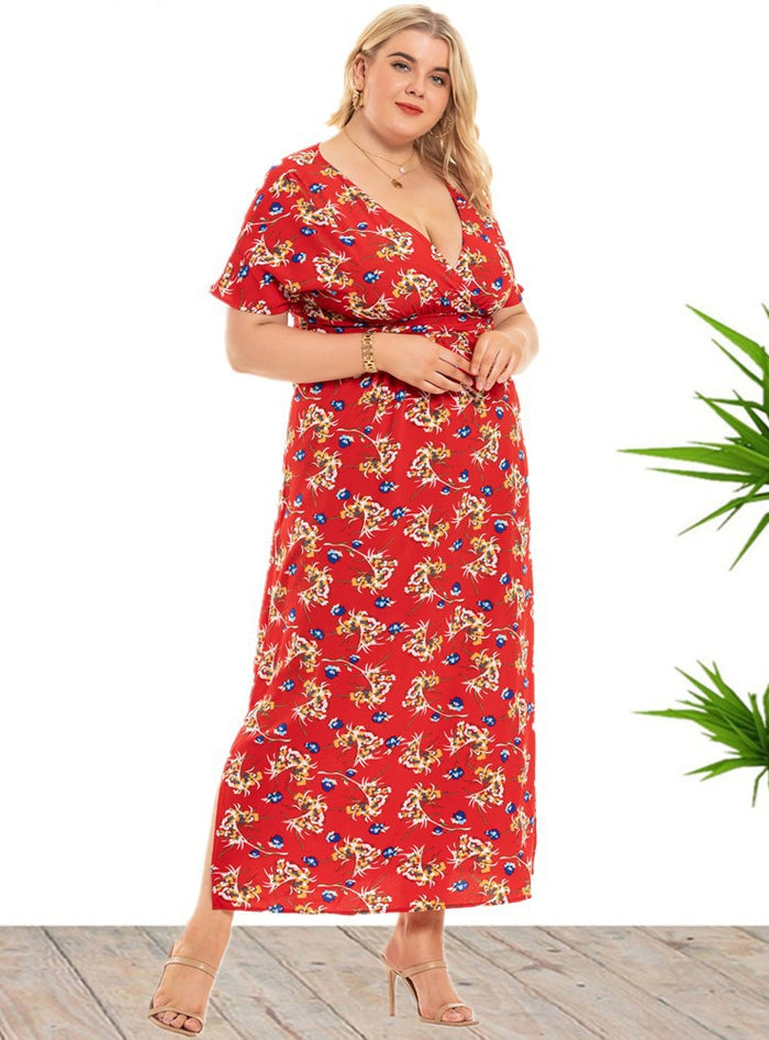 Floral V-neck Short Sleeve Split Dress