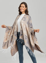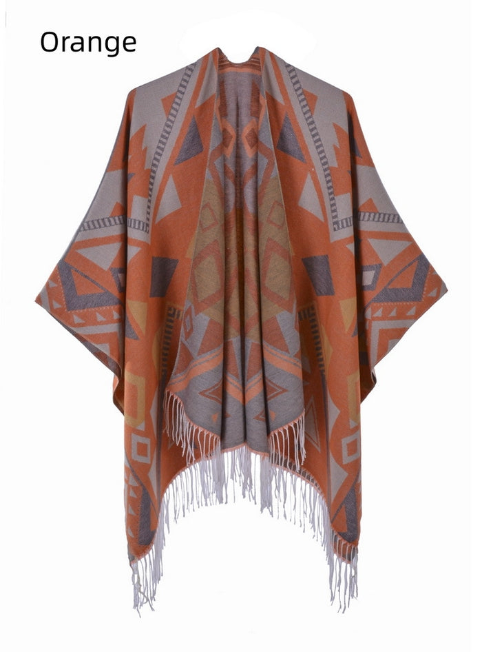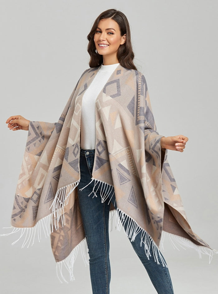 Welcome the season's colors with our Autumn Ochre Fringed Split Double-sided Cashmere Shawl Cloak. This luxurious garment, made from high-quality cashmere imitation, offers you incomparable warmth and comfort. Measuring 150CM by 130CM, it's ideally suited for office life, academic activities, or simple home relaxation. The geometric patterns, precisely woven using jacquard and plain weave methods, add a unique visual richness. Enhanced with popular curling details, this cloak is the essence of stylish warmth. It makes a thoughtful, high-quality gift as the days grow colder.