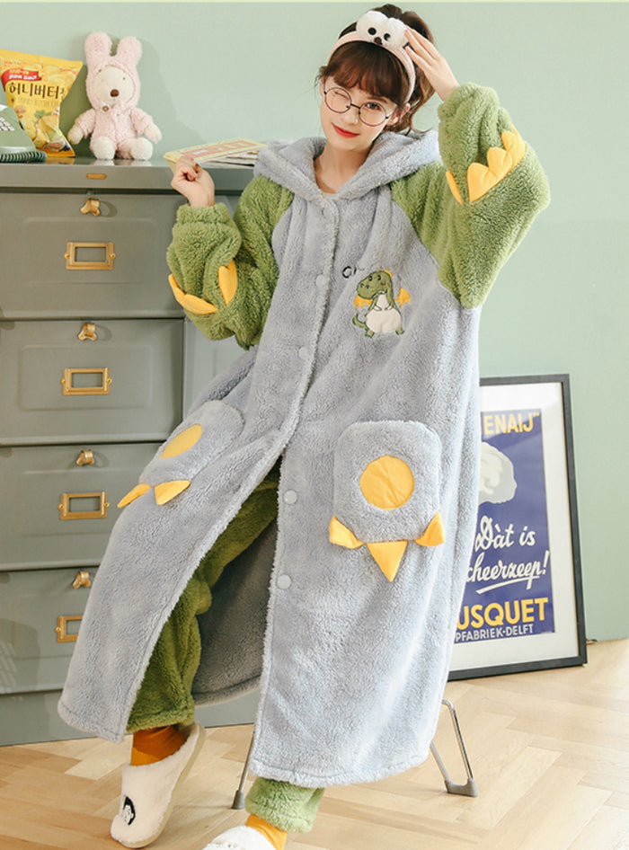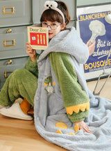 Green Dinosaur Pajama Flannel Velvet Padded Nightgown Hooded