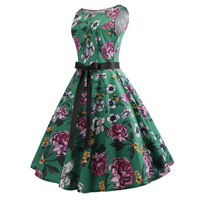 Green Flower Print Sleeveless Vintage Dress