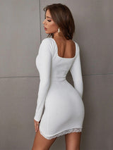 This ribbed lace detail long sleeve bodycon dress is perfect for any occasion, whether it's date night or elevating your everyday look. The dress features delicate lace detailing, long sleeves, and a flattering figure-hugging fit in a luxurious cream ribbed material. Pair it with fresh white sneakers and a chic clutch for a stylish and comfortable outfit.