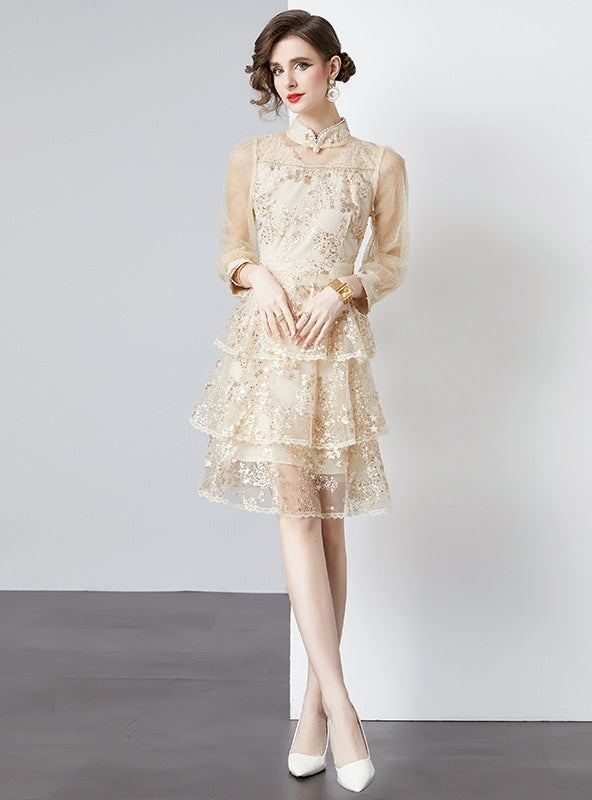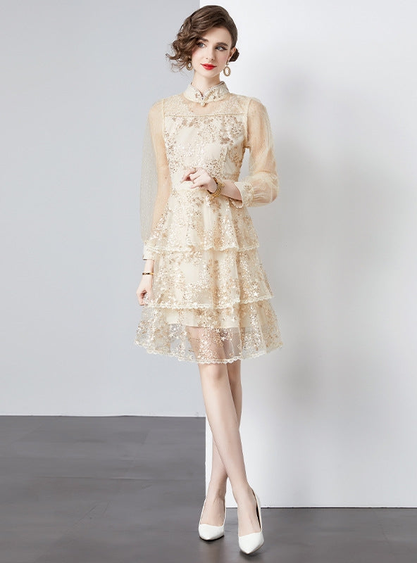 Fashioning a statement of timeless elegance, this tiered lace dress boasts a cascade of golden appliques, each one catching the light to shimmer with every movement. The high neck and long sleeves offer a classic silhouette, while the transparent layers add a contemporary touch of sophistication. Tailored to perfection, the dress nips in at the waist before flaring out into soft ruffles, creating a silhouette that is both flattering and whimsical. It's a dress that whispers tales of vintage charm and modern grace, perfect for high tea or an elegant evening event.