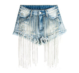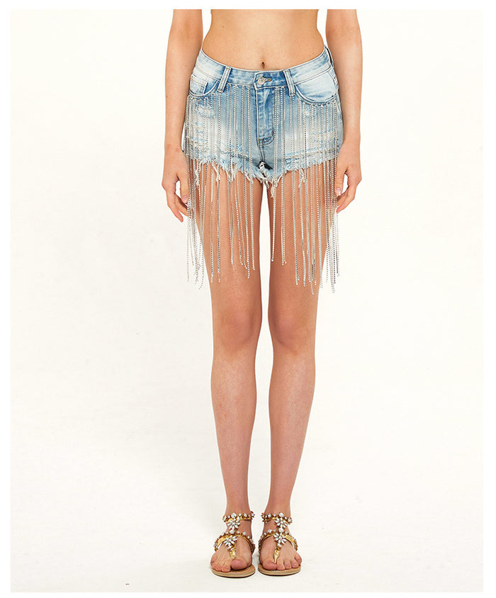 Paying homage to the rebellious spirit of the '60s and '70s, these shorts are a modern twist on retro fashion. The hand-worn, light blue denim is reminiscent of decades past, while the metal decorations and tassels add a contemporary edge.