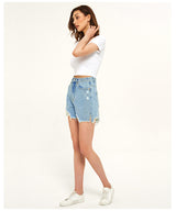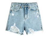 Travel back in time with these high-waisted, light blue denim shorts. The wide-leg cut and hand-worn detailing evoke a sense of vintage glamour. Skillfully designed zippers and buttons add a contemporary twist, making them the ideal blend of old and new. The light and loose fit guarantees day-long comfort.