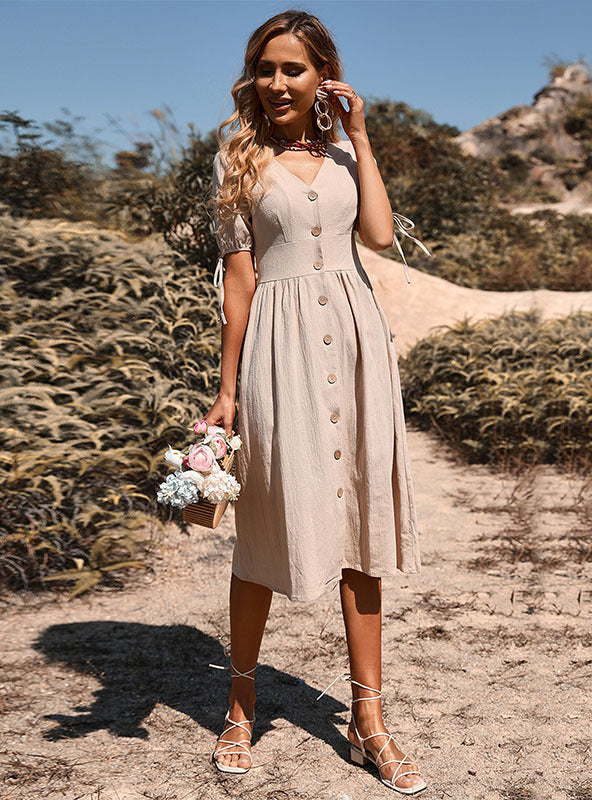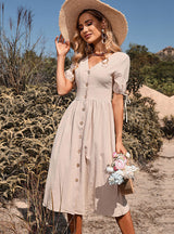 Medium-length Cotton Linen Button V-neck Short Sleeve Dress