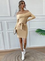 Elevate your new season wardrobe with this beige mini dress, doll. It's made with a stylish beige knit material and boasts a trendy bardot neckline and a flattering mini length that will have you looking on point. Pair it with some fashionable knee-high boots and some elegant gold accessories to complete the look and have you nailing this year's hottest trends. This dress is a must-have addition to your wardrobe.
