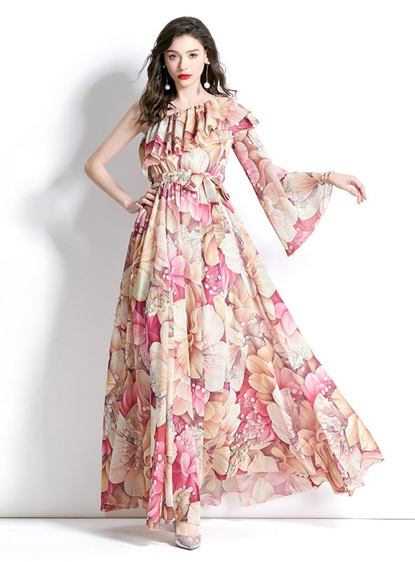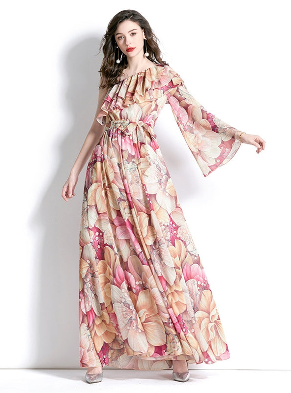 Inspired by the natural world, this maxi dress features a lush pattern of flowers and butterflies, suggesting the abundance of a secret garden at midnight. The off-shoulder neckline and sweeping skirt offer a romantic flair, while the belted waist creates a flattering profile. This dress is an ode to the enchantment of nature's most delicate creations, designed for those special moments that call for a touch of magic.