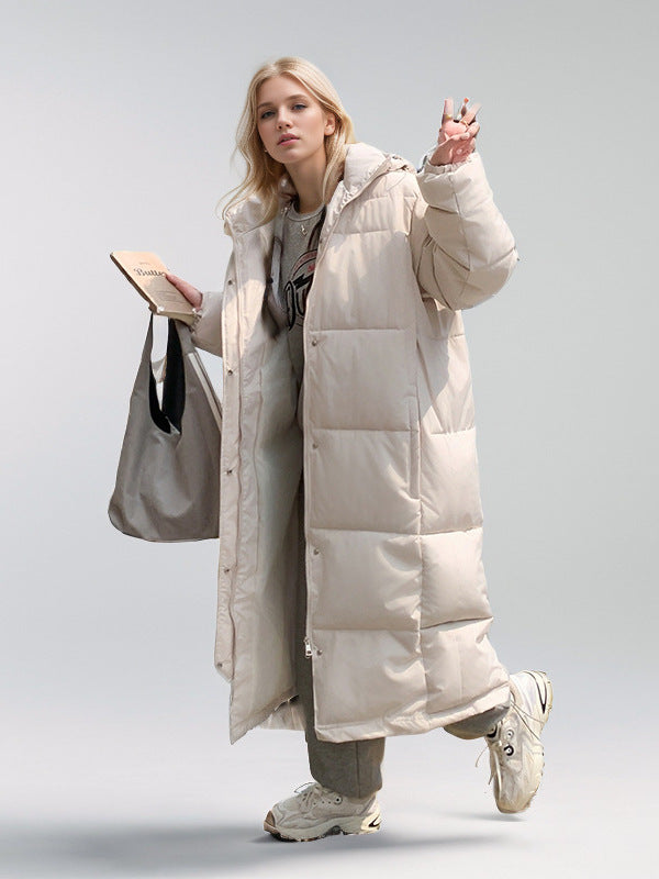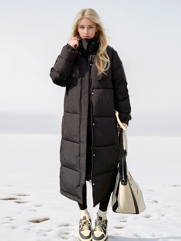 Layer up in style with this coat, a long, padded design that provides full coverage for ultimate warmth. This coat is a reliable companion for the coldest days, featuring a cozy hood and spacious side pockets for practicality. The length provides additional warmth, protecting you from chilly winds and keeping you comfortable outdoors. The sleek, streamlined design adds a modern touch, allowing you to look stylish while staying warm. Its neutral color makes it easy to match with various outfits, ensuring versatility in your winter wardrobe. This coat is perfect for anyone looking for a combination of comfort, functionality, and timeless style, making it a must-have for cold-weather adventures.