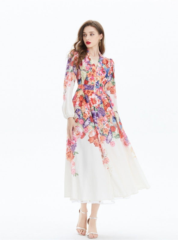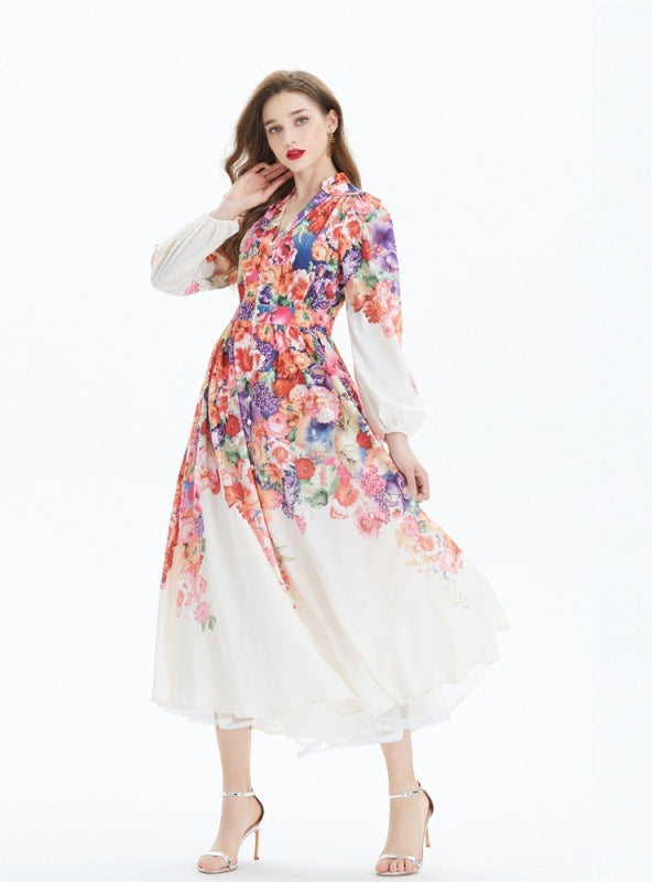 Bathed in a tapestry of floral splendor, this long-sleeved maxi dress radiates a romantic aura fit for any dreamy occasion. With its rich mosaic of vibrant blossoms that cascade from the shoulders to the hem, the dress evokes the splendor of a flourishing garden. The bodice, graced with a deep v-neckline, gives way to a cinched waist, where the pattern converges to flatter the figure before flowing out into an A-line skirt that whispers of elegance with every movement. The sheer sleeves billow gently to the wrists, offering a hint of whimsy and grace. This dress is a wearable piece of art that calls to those who carry an appreciation for nature’s beauty and a love for fashion that makes a statement.