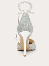 Fall in love with these vintage-inspired pumps in platinum ice dusty glitter, where the boundaries between shoes and jewelry beautifully blur. This perfect bridal pair is adorned with a delicate crystal chain that gracefully embraces the ankle like fine jewelry, suspending a single crystal.