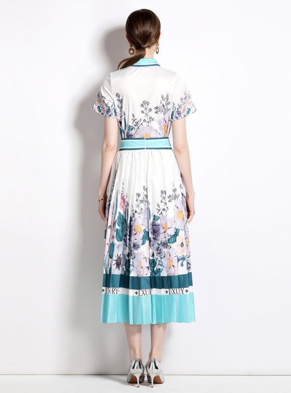 Desiring a dress that speaks volumes about your exquisite fashion sense? Consider this poetic ensemble, where the beauty of floral prints cascades into a turquoise declaration of luxury and glory. The dress's smart collar and tie-neck provide a sophisticated touch, and the printed waistband adds a modern flair to the timeless midi-length skirt. It's a dress that's as perfect for a day at the office as it is for a weekend brunch.