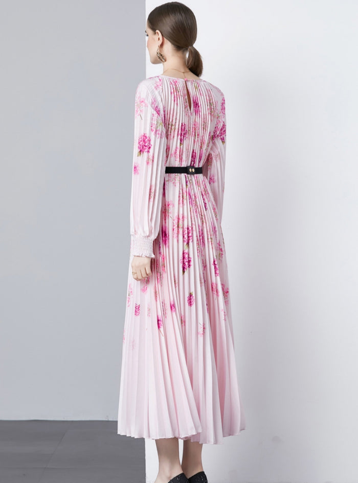 Magnificence blooms in the form of this exquisite pleated midi dress. A canvas of the softest pink serves as the backdrop for vibrant splashes of fuchsia florals, evoking the first breath of spring on a serene canvas. Crafted with precision, the pleats fall in a meticulous array, creating a structured yet fluid silhouette that sways with poetic grace. The round neckline and long, billowing sleeves echo the timeless femininity of a bygone era, while the cinched waist, highlighted by a sleek black belt, brings the dress into the realm of contemporary elegance. It's an ensemble that balances the delicacy of floral print with the boldness of modern design—ideal for those who walk with a regal air and carry a love for the dramatic.