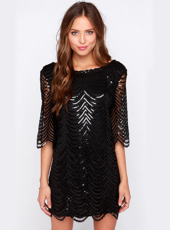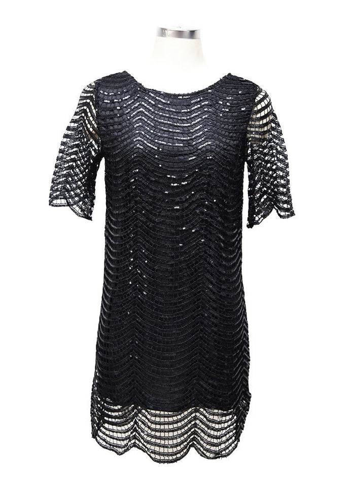 The intricate sequin detailing and crochet scallops create a mesmerizing effect that's sure to turn heads. The beige shift bodice provides a neutral canvas for the sequins to shine, while the scoop neckline and low-dipping back add a touch of sophistication. The sheer half sleeves with bell cuffs give the dress a romantic feel. To complete the look, pair it with nude heels and delicate jewelry. For the hairstyle, a sleek low bun or loose waves would be perfect. Wear it with confidence and let your inner goddess shine!