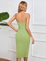 Elevate your weekend outfit with this chic dress that's sure to make you stand out. It boasts a gorgeous green slinky material with a multi-tie design and a chic midi length that exudes sophistication. Style it with some statement hue heels and a matching bag for a next-level look that we're absolutely loving. You won't want to miss out on this dress!