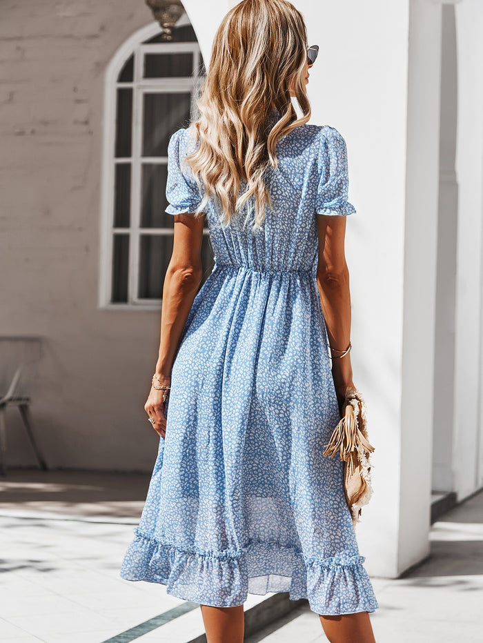 Dance the night away under the stars in the Lilacoo Maxi Dress. The dress features small dots floral print on sheer woven chiffon, creating a playful and romantic vibe. The V-neckline and double-ruffled short sleeves add a touch of elegance to the dress, while the alluring open back is accented with a tying detail and smocking for a perfect fit. The set-in waist is accented with a decorative placket of covered buttons, creating a flattering silhouette, and tops a full A-line maxi skirt with twirly tiers and a sultry side slit, making it perfect for twirling on the dance floor. Get ready to enchant with this charming dress.
