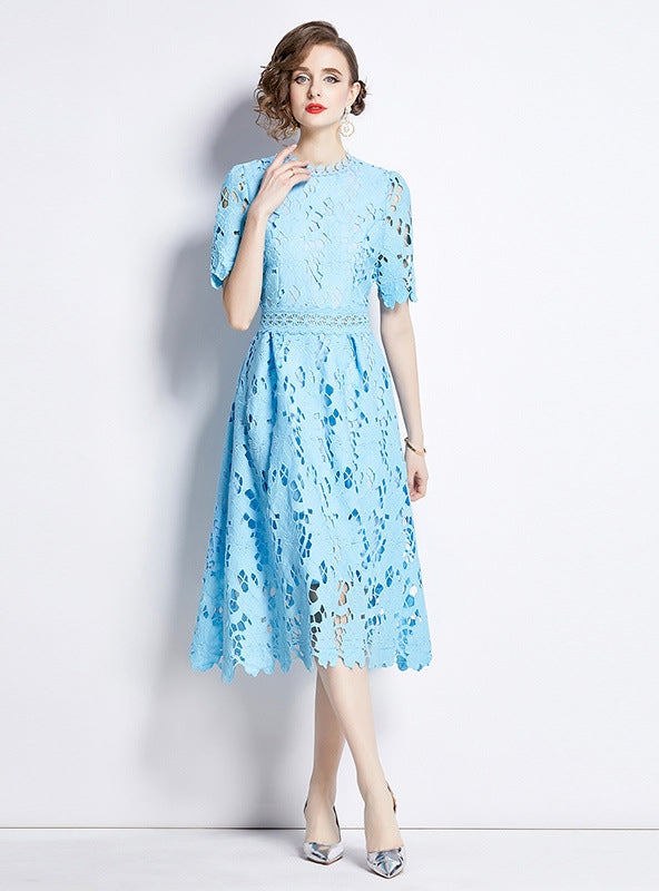 Outfitting you in a vision of serene blue, this lace dress captures the essence of spring's first bloom. The fresh, sky-blue hue is a canvas for the elaborate lace overlay, which is meticulously designed to mimic the intricate patterns of natural flora. With mid-length sleeves and a demure knee-length skirt, the dress balances elegance with a playful touch of youthfulness. The waist is cinched with a fine, tailored band, emphasizing an hourglass figure, while the sheer neckline and sleeve details offer a peek into the careful construction and attention to detail. This dress is a charming selection for day weddings, afternoon teas, or any occasion that calls for a touch of grace and a breath of fresh air.