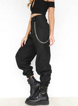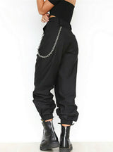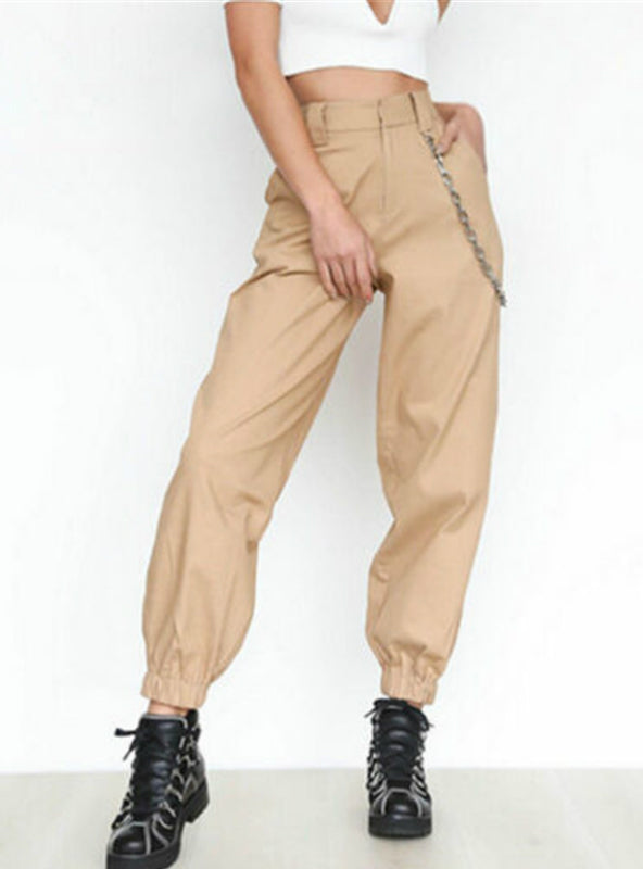 Elevate your casual wardrobe with these women's cargo trousers. Made from a blend of cotton and polyester, these pants offer both comfort and durability. Featuring a solid color and a loose fit, these pants are perfect for everyday wear. The high waist design provides a flattering silhouette, while the chain side pockets add a touch of edginess to the look. The elastic waistband and full-length design make these pants easy to wear and style. Whether you're running errands or lounging at home, these cargo trousers are the perfect addition to your wardrobe.
