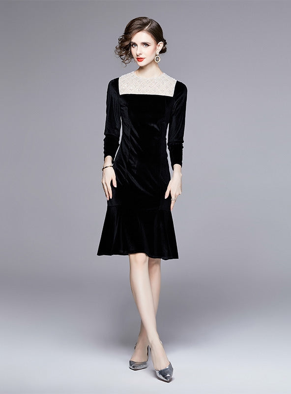 Majestic elegance is redefined in this exquisite black velvet dress, designed for the woman who moves with grace and sophistication. The garment embodies timeless charm, featuring a contrasting cream lace collar that provides a classic touch of vintage allure. Luxurious to the touch, the velvet fabric forms a gently fitted bodice before flaring out into a playful, flounced hem, offering a dance of shadow and light with every step. The full-length sleeves culminate in matching lace cuffs, adding just the right amount of delicate detail. This dress is a perfect choice for those winter evenings where style demands warmth without sacrificing the splendor of femininity. A hidden zipper ensures a sleek back profile, cementing this piece as the epitome of chic modesty and understated opulence.
