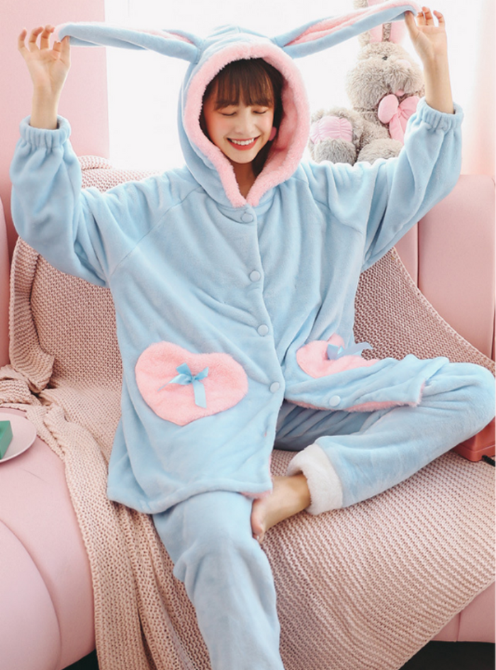 Women Blue Long Sleeve Pink Pocket Sleepwear