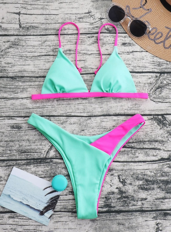The Green Triangle Bikini Top is a timeless classic that never goes out of style. This classic triangle bikini top is updated with a ribbed fabric and adjustable ties at the neck and back, ensuring a comfortable and customizable fit. The matching low-rise bikini bottom features a ribbed fabric, a high-cut leg, adjustable tie sides, and cheeky seat coverage, providing both style and comfort. Whether you're lounging by the pool or taking a dip in the ocean, this bikini set is the ultimate choice for a stylish and comfortable swimwear option. Don't miss out on this must-have piece for your swimwear collection!