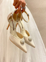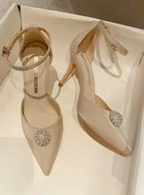 Elevate your style with this stunning stiletto pump, featuring a chic crystal accent on the pointed toe and delicate ankle straps for a touch of glamour. Perfect for adding a touch of femininity to any outfit, this high heel will have you turning heads wherever you go.